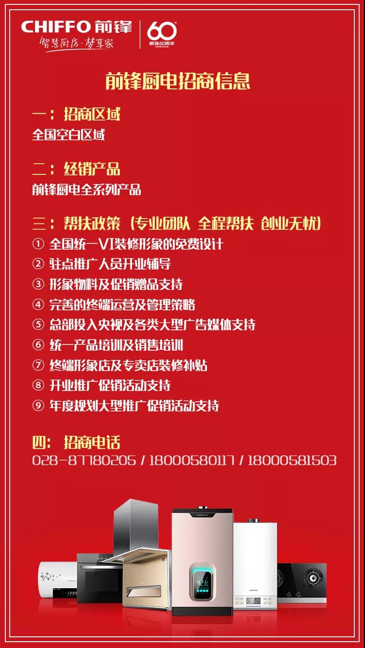 前鋒廚電不僅依托實力雄厚的前鋒集團,對經銷商進行強勢品牌支持,讓其感受到來自品牌的力量,還將從全國統一VI裝修形象的免費設計、駐點開業輔導、形象物料及促銷贈品支持、完善的終端運營及管理策略、總部廣告媒體支持、統一產品培訓及銷售培訓、終端形象店及專賣店裝修補貼、開業推廣促銷活動支持、年度規劃大型推廣促銷活動支持九大方面全方位地對經銷商進行支持,全程專業團隊指導,讓加盟前鋒的合作伙伴創業無憂。