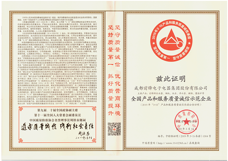 近日,從中國質量檢驗協會傳來喜訊,在中國質量檢驗協會主辦的“2019年3·15產品和服務質量誠信承諾”主題活動中,成都前鋒電子電器有限股份公司憑借優質的質量,完善的售后服務,較高的品牌信任度,榮獲“全國產品和服務質量誠信示范企業”榮譽稱號。