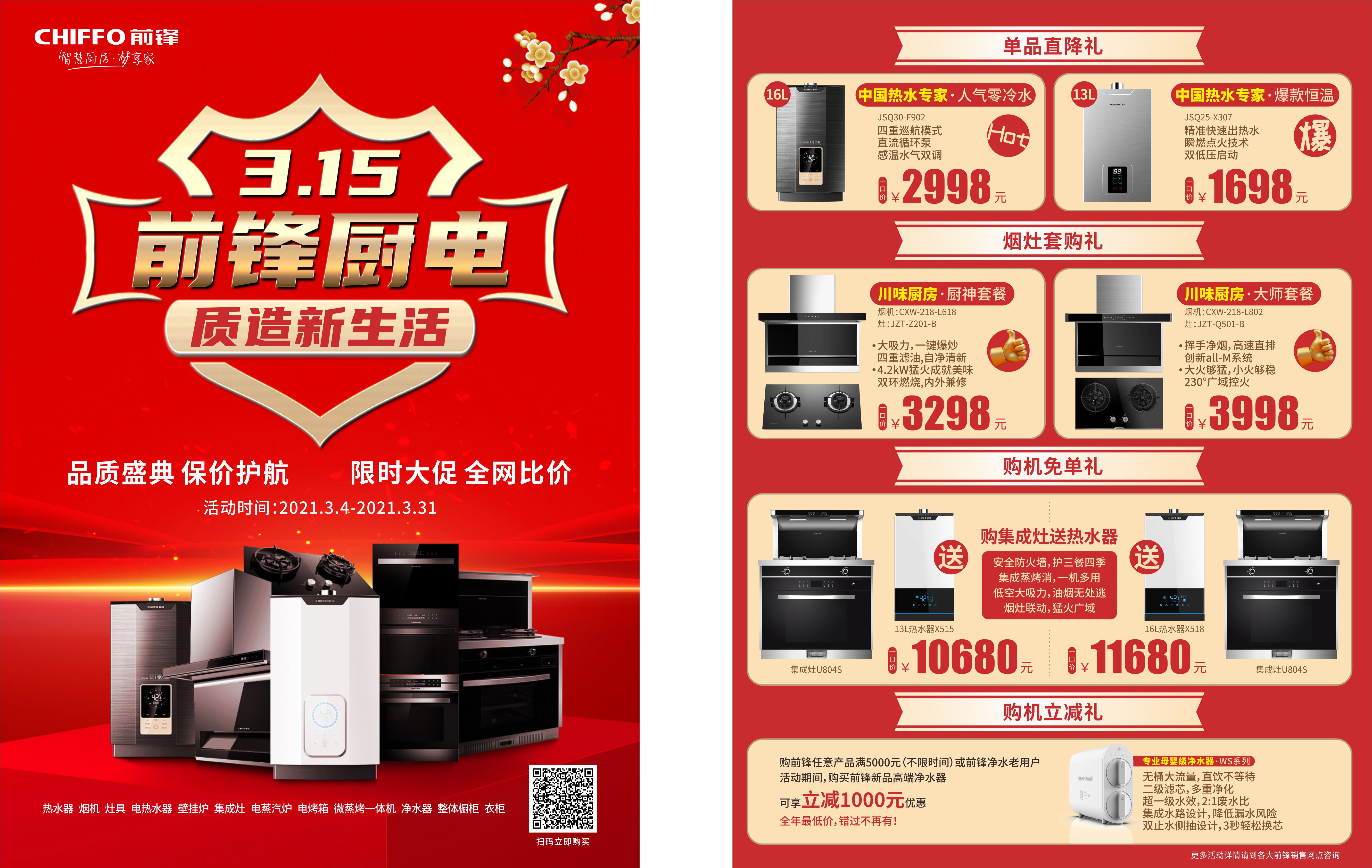 購買前鋒人氣爆款熱水器享現金直降;精選川味廚房煙灶套餐,給您的廚房裝備絕佳利器;購買指定蒸烤消多功能集成灶機型,立贈人氣熱水器一臺,同時還有針對凈水器用戶推出的購新機及換新用戶直減千元優惠大活動……